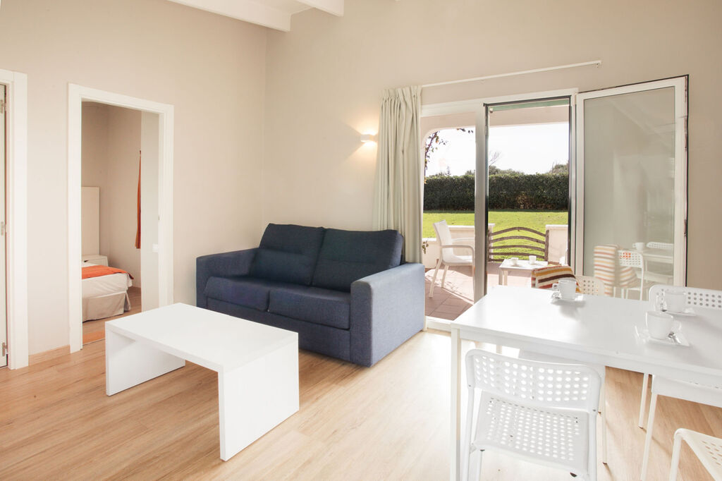 Suite für einen entspannten Familienurlaub: gemütliches Wohnzimmer, ein Doppelzimmer und ein Einzelzimmer. Die Terrasse ist mit einer großen Rasenfläche verbunden, ideal für eine Tasse Tee, zum Spielen oder um sich hinzulegen und die Brise Menorcas zu genießen. Licht, Geräumigkeit und eine Atmosphäre, die dazu einlädt, sich zu entspannen und Ihren Urlaub zu genießen.